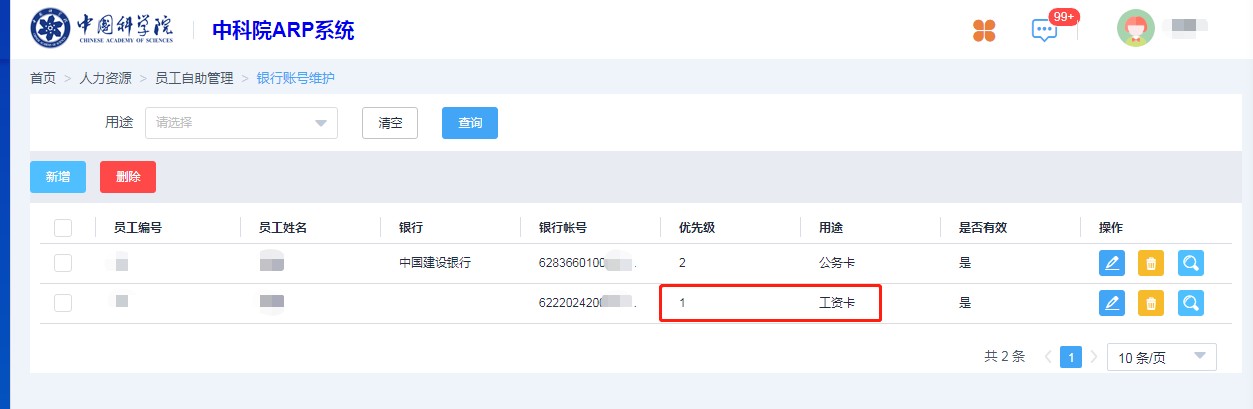 路徑為:人力資源—員工自助—銀行賬號維護,選擇優先級為“1”的“工資卡”右側編輯按鈕,核對其中“銀行”及“支行”信息是否有誤。